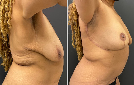his patient lost 135lbs felt much healthier with more energy. She was still bothered, however, by her extra abdominal skin and the droopiness of her breasts. She was also uncomfortabel with the extra loose skin of her lateral chest. The fleur de lis procedure was chosen to maximize the contour of her central abdomen and the mastopexy with thoracoplasty was able to lift and fill her breast while also removing the excess skin from the lateral chest. She is shown 1 year post operatively.